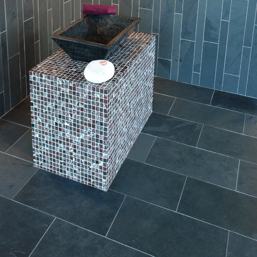 Ce dallage en Ardoise Noire est la solution pour révéler une touche d’authenticité à votre intérieur. Classe, ce dallage décore une salle de bains, par exemple, vous pouvez opter pour le « tout ardoise ». Ou alors, n’hésitez pas à varier les plaisirs et opter pour sa teinte noire et sombre, à marier avec d’autres coloris opposés comme du blanc. En dallage, il mettra en valeur votre cuisine blanc laqué. Vous pourrez aussi le poser sur un pan de mur pour mettre en lumière une pièce de mobilier blanc pur par exemple. Si vous êtes un adepte du bois, le dallage peut être combiné parfaitement pour un effet plus rustique et chaleureux !