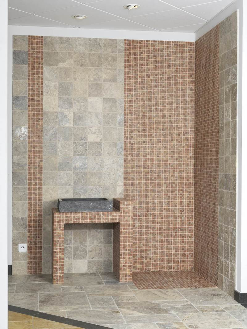 Ce dallage est en pierre naturelle (travertin gris) composé de 4 dimensions différentes; 20x20, 20x40.3, 40.3x40.3, 41x61 avec une épaisseur de 1.2 cm. Sa finition antic présentant quelques aspérités et ses couleurs dans des nuances de gris font de lui l’atout déco idéal pour sublimer une salle de bain moderne et originale ou bien pour donner un cadre intemporel et confortable à un intérieur unique.