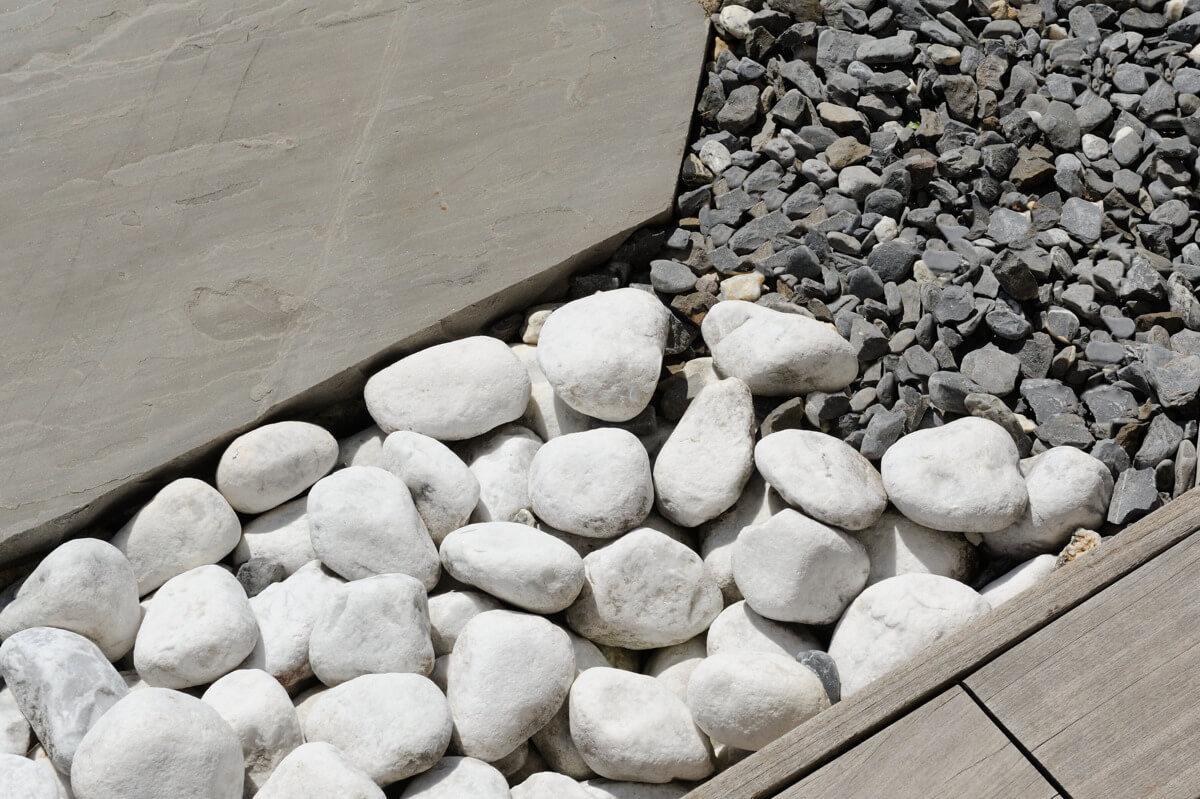 Osez le total look minéral en associant les galets Bianco avec un dallage extérieur en pierre naturelle.