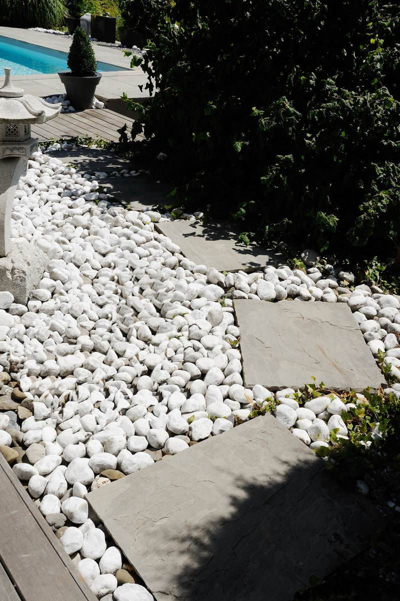 Entourée de verdure, les galets Bianco sauront se fondre dans le décor extérieur naturel.