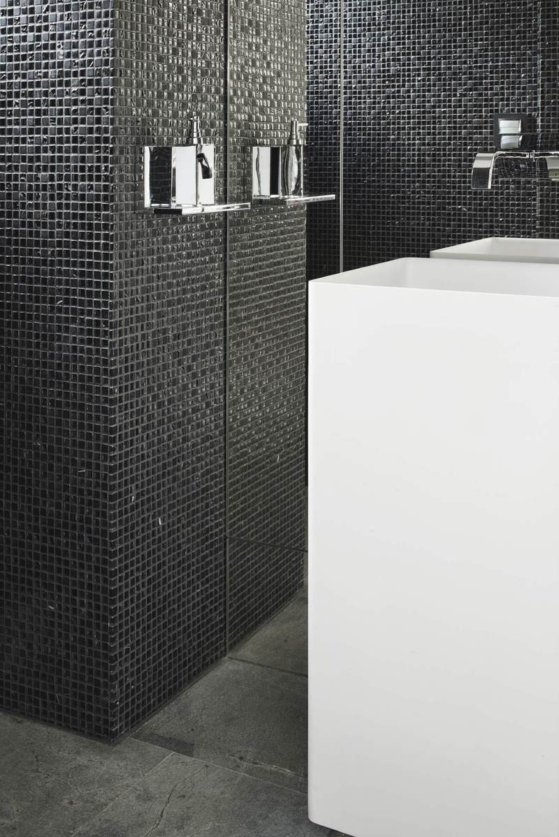Basée sur un parfait équilibre entre matité et brillance, la mosaïque Chrome Color habillera les murs d’une salle de bain, d’une douche ou d’une cuisine en y apportant luminosité et modernité. Pierre naturelle et verre se marieront en beauté pour un ensemble pétillant et très graphique. Dans la salle de bain, posez-la en touche déco scintillante le long d'une colonne de douche, sous forme de frise ou sur un pan de mur pour structurer l’espace. Associez la mosaïque Chrome Color avec des miroirs pour éclairer la pièce et accentuer encore les reflets. Dans un spa, mariez ses effets brillants avec un sol noir mat. Laissez place à cette mosaïque en revêtement intégral, combinée à un dallage en ardoise noir pour un total look black particulièrement glamour et raffiné.