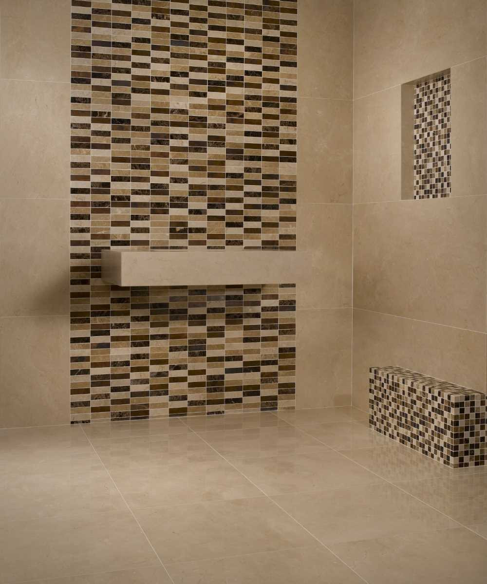 Présentée sur une trame de dimension 30X31.8 cm, ce produit se fixe facilement sur mur et sol. Elle peut se mixer avec un dallage clair, comme le dallage en pierre travertin clair opus romain