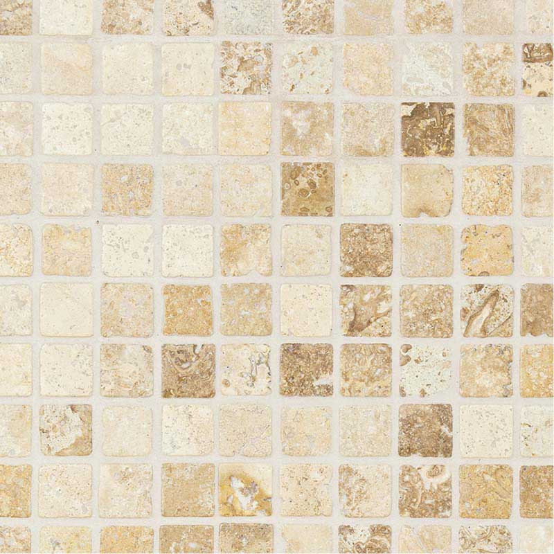 La mosaïque Travertin Golden Walnut mêle des petits carreaux de pierre travertin noisettes et brun clair d’une taille de 2,3 X 2,3 cm. Cette mosaïque est présentée sur des trames en nylon de 30.5x30.5 cm.