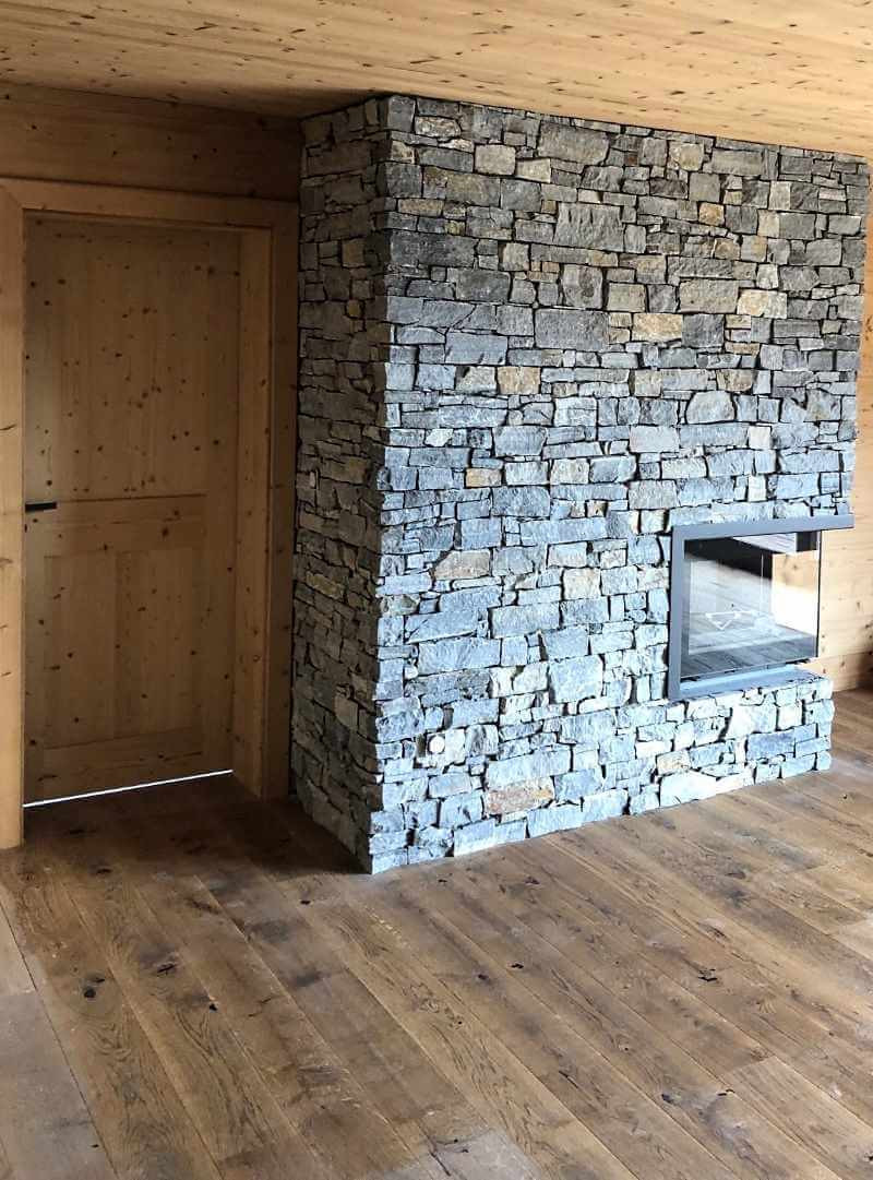 La pierre naturelle légèrement irisée dans laquelle est façonné le parement en fait un atout lumineux en intérieur, qu'il est possible d'accentuer avec un jeu d'éclairage bien pensé. Parfait pour habiller le tour d'une cheminée, il se marie très bien avec un parquet bois et des meubles à l'esprit scandinave ou montagnard. Pour casser son côté rustique et massif, jouez le décalage en l'associant à du mobilier épuré et très contemporain. - Les avantages