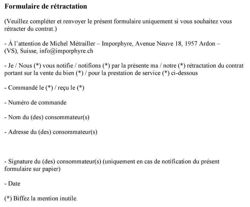 Pour exercer le droit de rétractation, vous devez nous notifier votre décision de rétractation du présent contrat au moyen d’une déclaration dénuée d’ambiguïté (par exemple, lettre envoyée par la poste à l'adresse Michel Métrailler - Imporphyre SA, Avenue Neuve 18, 1957 Ardon - (VS), Suisse, par téléphone au +34 (0)27 306 33 73 ou par Email à l'adresse info@imporphyre.ch.