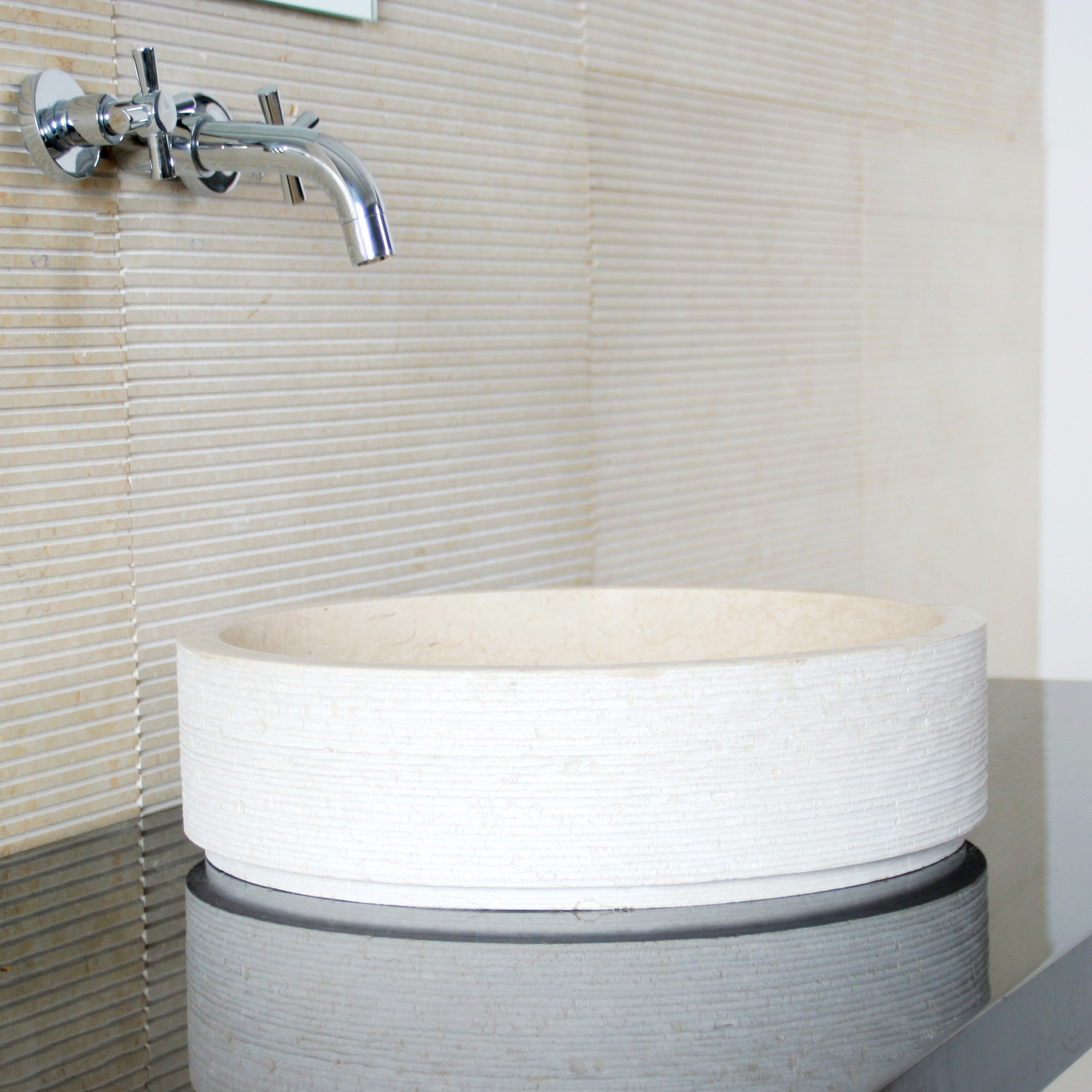 Son petit format la rend facile à poser et peu encombrante. Installée directement sur un meuble, elle s’intégrera aisément dans votre intérieur. Son format cylindrique apportera une touche d’originalité à votre salle de bain ou votre cuisine et met parfaitement en valeur le contraste des finitions de la pierre naturelle de calcaire clair.