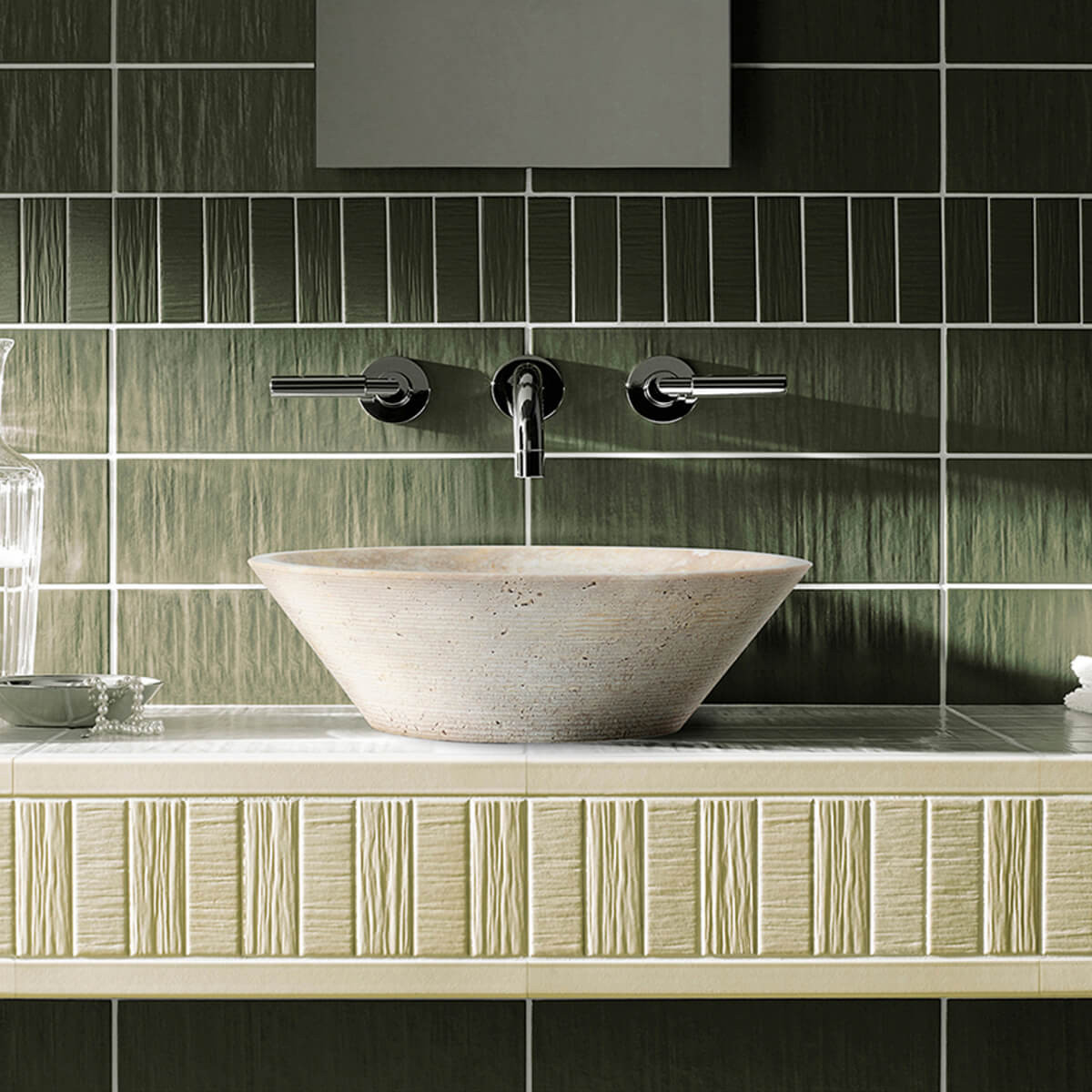 Dans un esprit antique revisité, n’hésitez pas à marier cette vasque beige avec un dallage en travertin noisette façon opus romain et un meuble en bois clair. Au mur sous la forme d’une simple frise, ou en total look sous la vasque, une sobre mosaïque en camaïeu viendra finaliser cette ambiance apaisante et hors du temps. - Les avantages