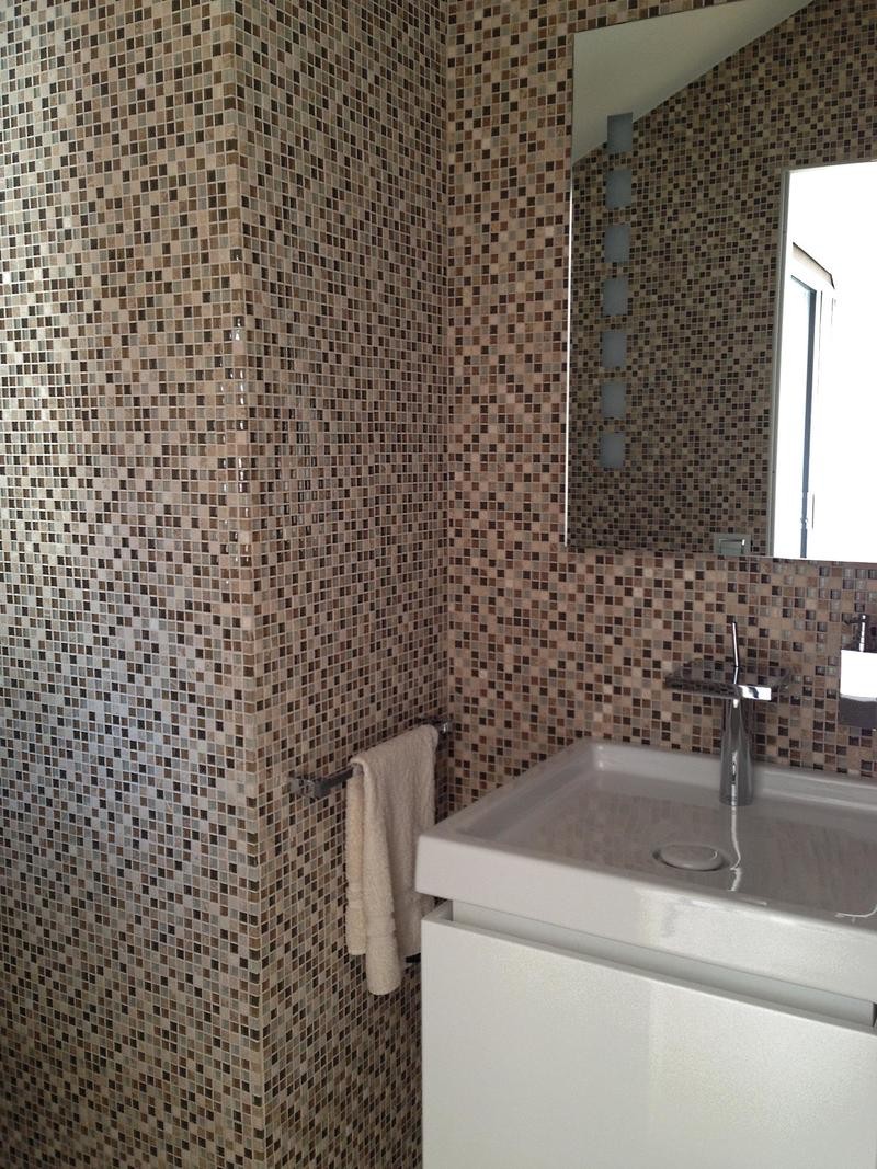 La surface composée de mosaïque saura animer l’espace en apportant une touche graphique colorée délicatement nuancée de brun et de vert.
